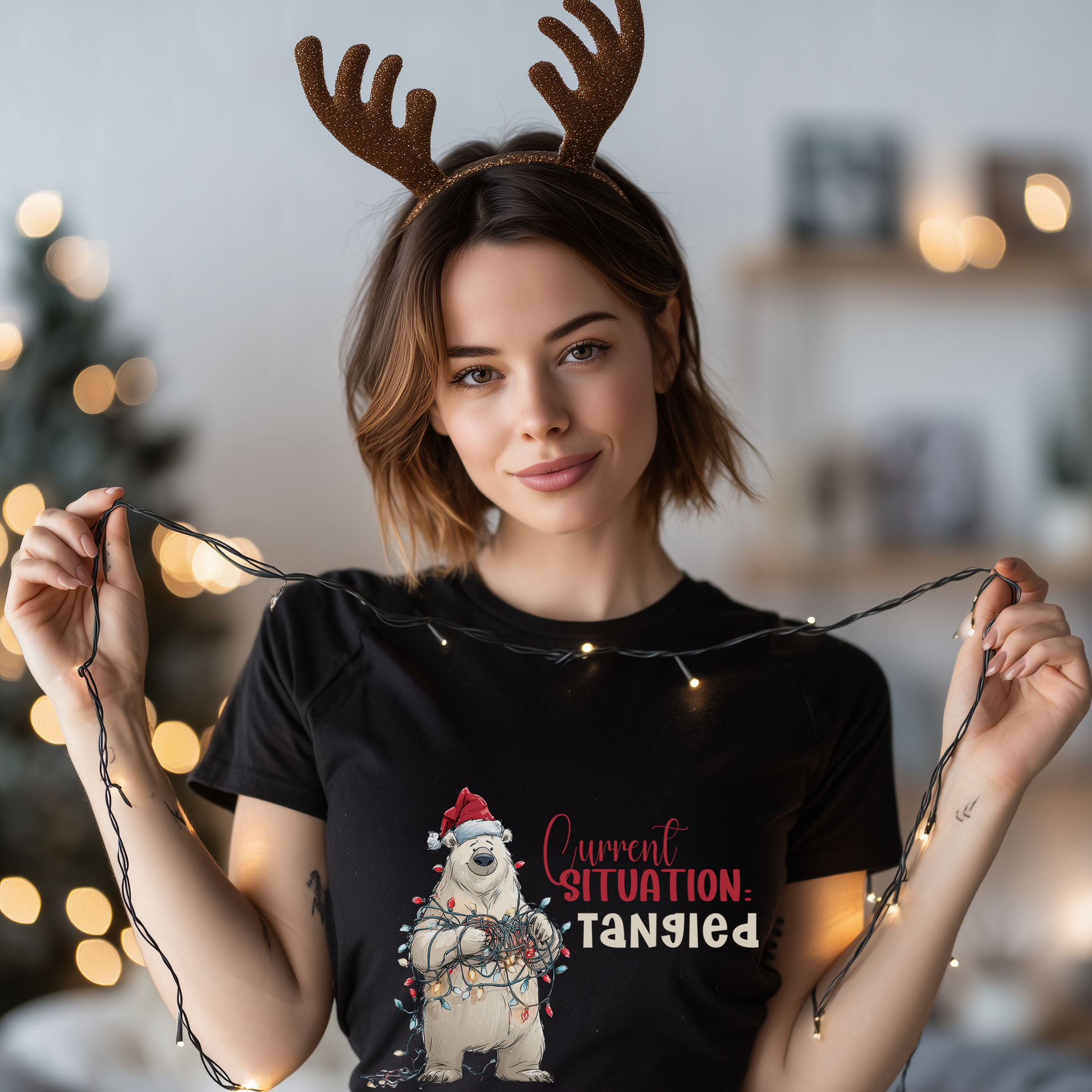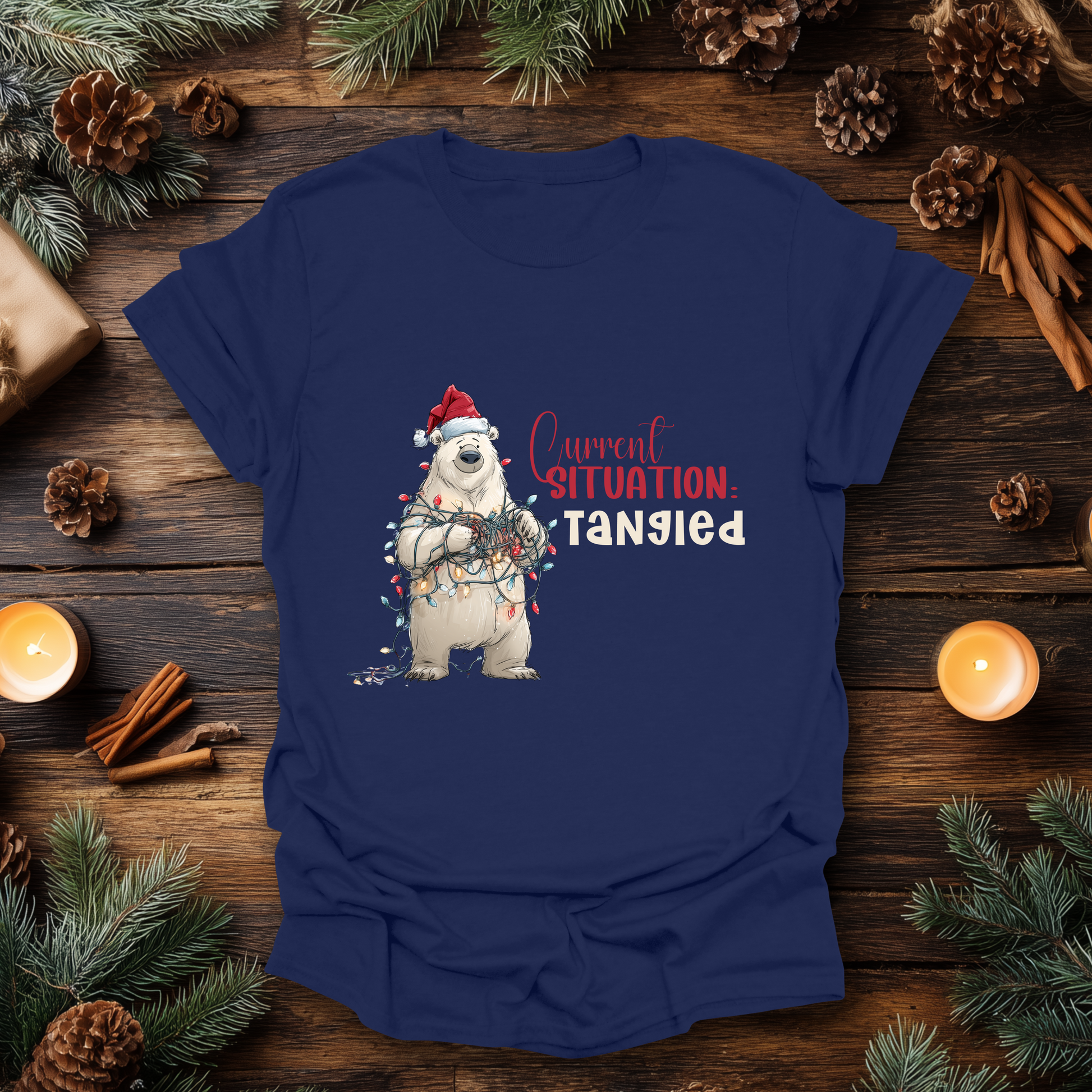 from 0 reviewsEver try to hang the Christmas lights and end up in a knot? You’re not alone, this bear gets it. The Current Situation: Tangled Tee captures the holiday struggle in the funniest way possible, featuring a Santa-hatted polar bear wrapped up in a glowing mess of festive lights.