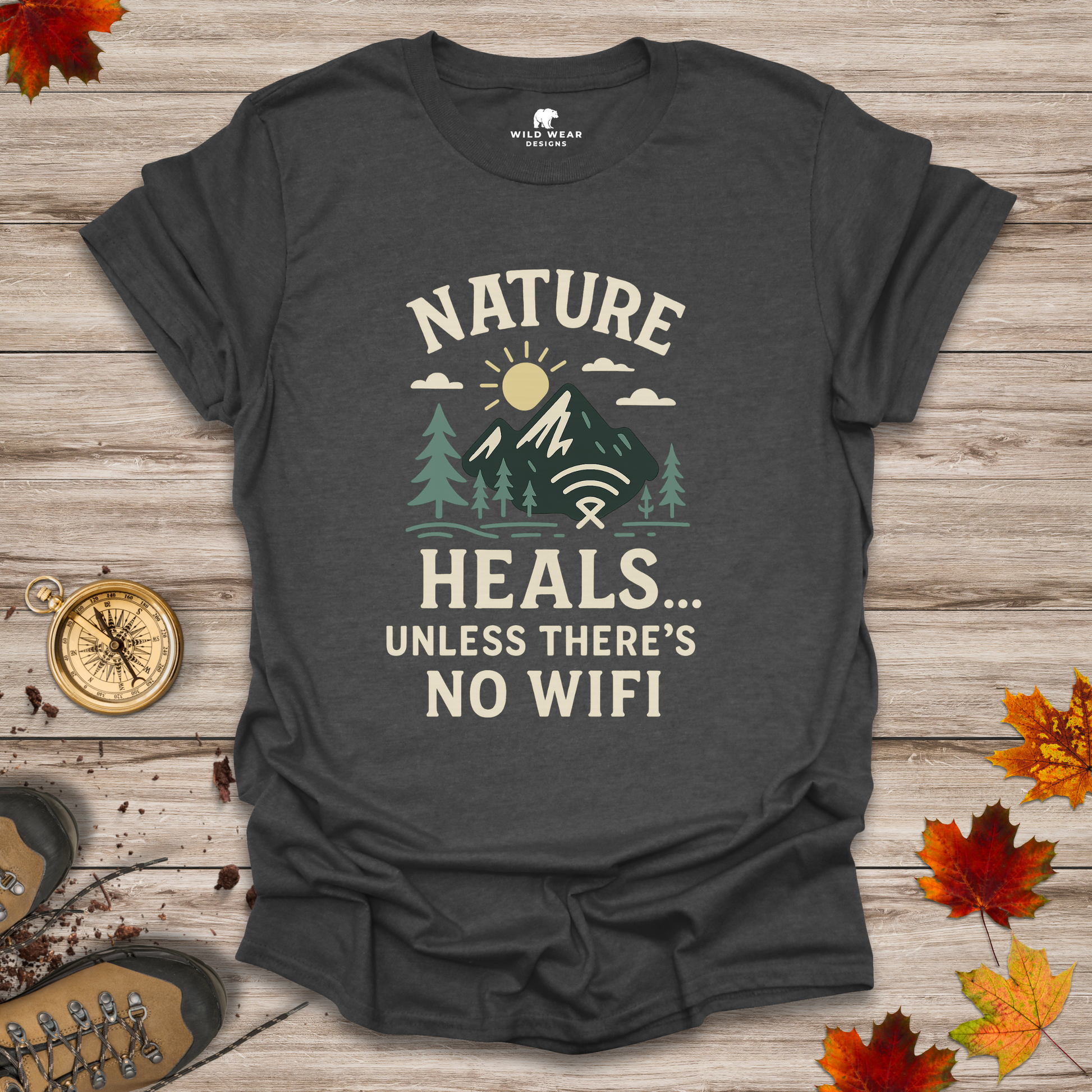 Whether you're off-grid or just pretending to be, this soft, bold shirt reminds the world that nature heals... but only if your Insta loads. Perfect for tent rebels, forest meme lords, and comfort-seeking adventurers.