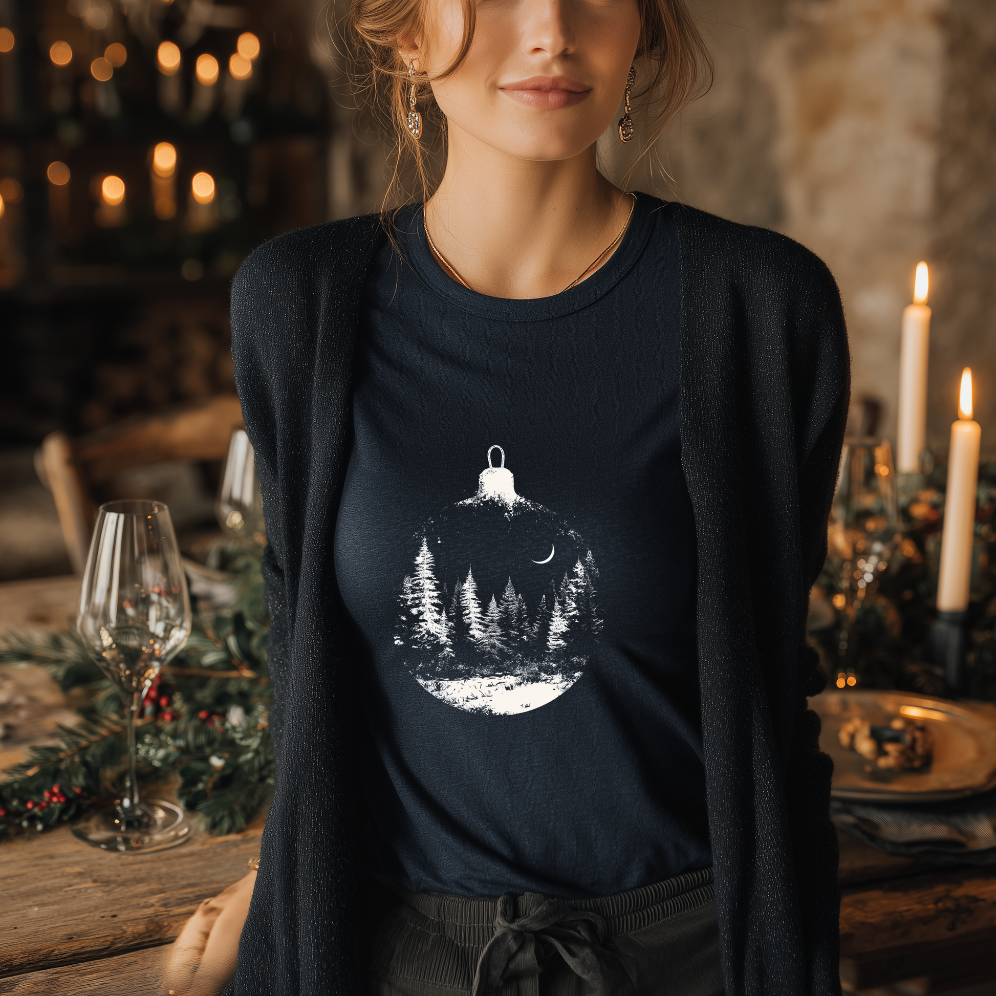 from 0 reviewsWhy settle for glittery ornaments when you can wear one made of trees and moonlight? The Moonlit Forest Ornament Tee brings a slice of the wilderness to your holiday season, no tangled lights required.