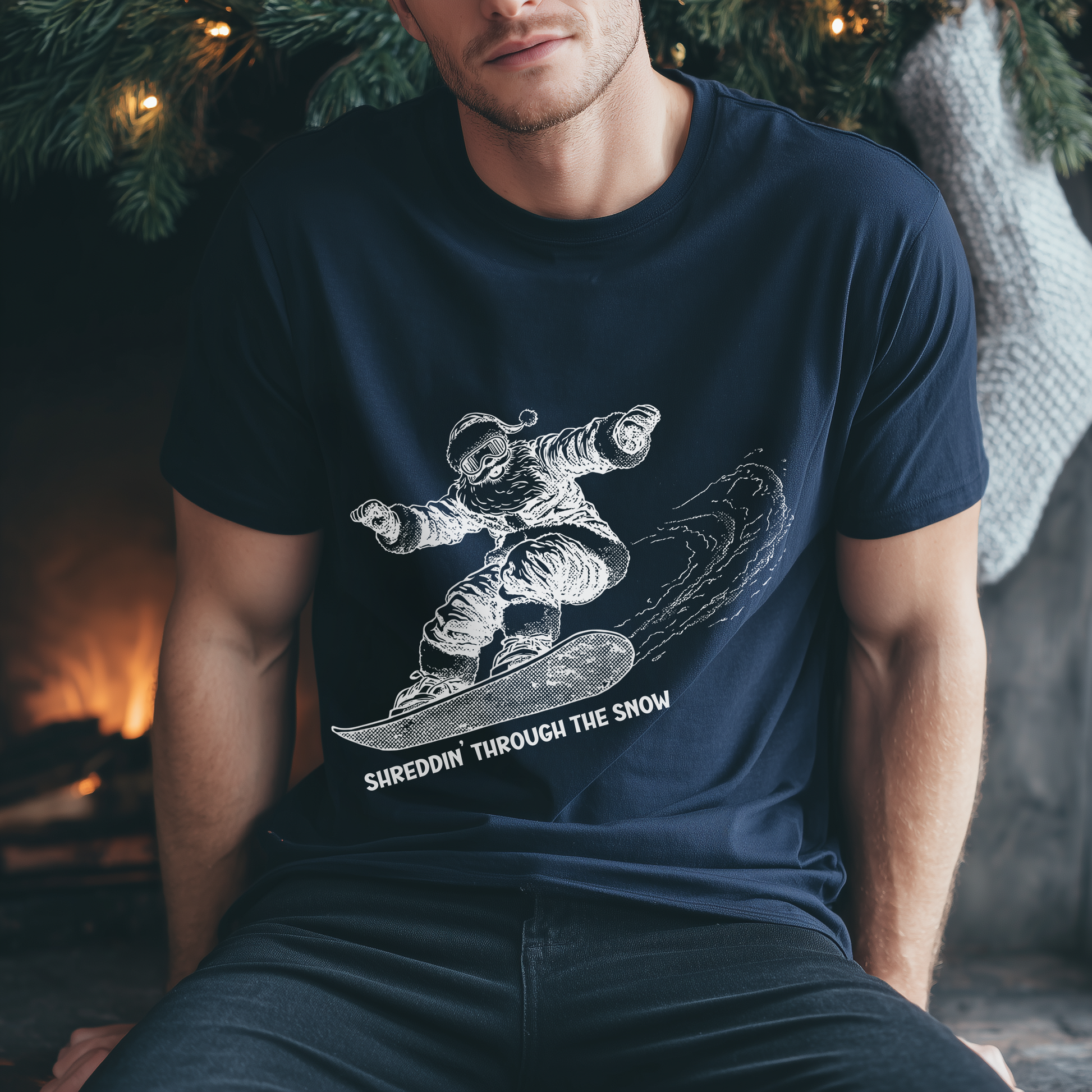 from 0 reviewsWho needs a sleigh when you’ve got a snowboard? This bold tee features Santa Claus carving fresh tracks and proving he’s the real king of the mountain. With its retro graphic style and holiday twist, the “Shreddin’ Through the Snow” shirt is perfect for Christmas parties, ski trips, or just kicking back après-ski. A must-have for snowboarders, skiers, and anyone who loves their holidays with a little extra edge.