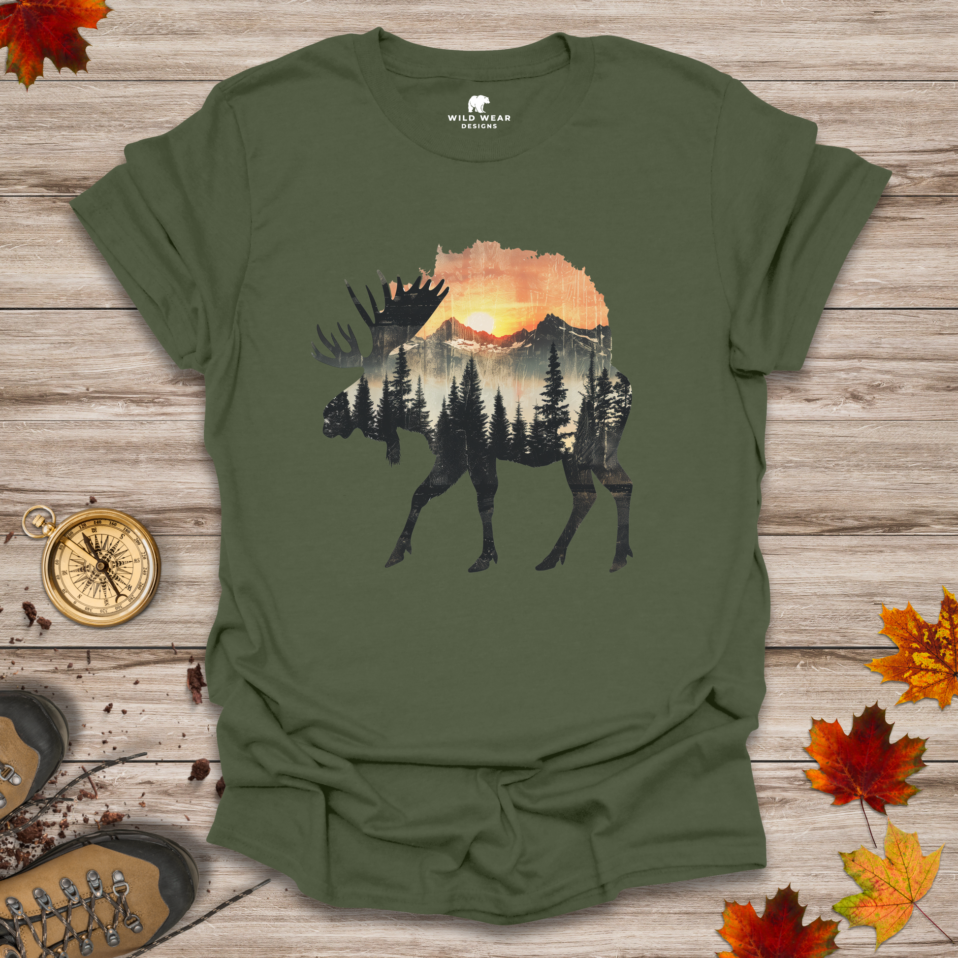 This t-shirt captures that magic hour where golden skies meet rugged trails, featuring a bold silhouette of a moose roaming free under a radiant sunset. Whether you're an adventurer, a nature lover, or someone who just knows when to disappear into the trees, this tee is your uniform.
